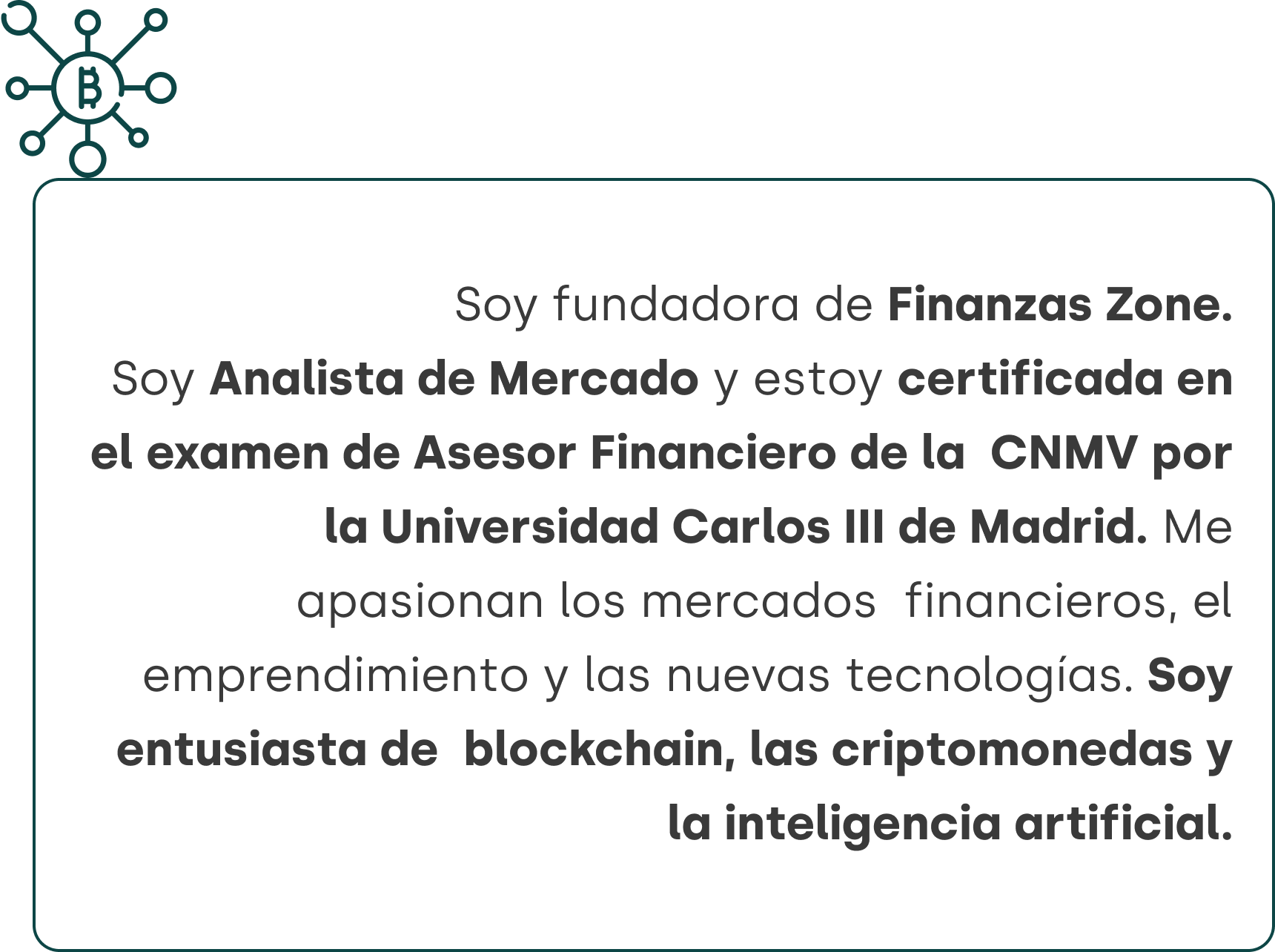 Además, me he formado en programación en R y Python, inteligencia artificial aplicada a las finanzas, marketing digital, blockchain, DeFi, entre otras áreas.